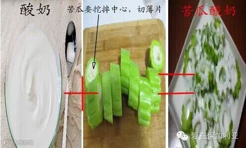 第二种方法,将酸奶倒在稍宽一些的容器中,比如盒子、碗盆等等,然后将新鲜的苦瓜洗干净,挖空心,切成薄片或者榨成汁,与酸奶混合,把该酸奶放入冰箱里冷藏一段时间,然后拿出来吃,减肥的效果非常好,本人试验过,如果嫌味道苦,那么把苦瓜切薄一点,冷藏时间稍长一点,就不是那么苦了,可以代替零食。