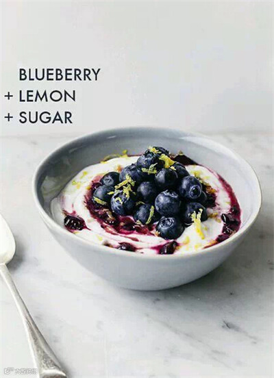在碗内放入对半切开的蓝莓君,以及新鲜柠檬汁和砂糖,拌匀后放入酸奶。最后在顶部放上整颗的蓝莓和刨好的柠檬皮屑。