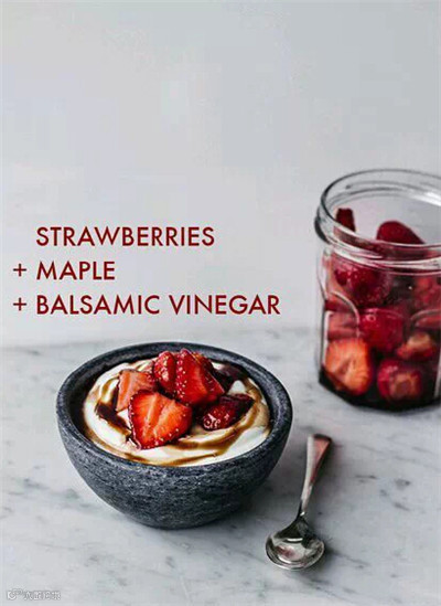 在碗内放入香醋和枫糖浆,混合后再加入草莓,浸渍30分钟左右。放入酸奶,开吃!