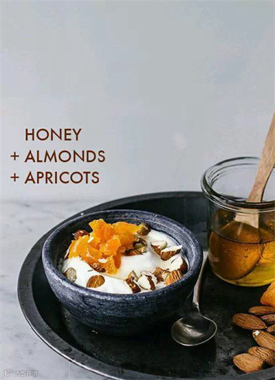 将蜂蜜倒入酸奶内拌匀,放入碎杏仁和切碎的杏子,最后放一小点儿蜂蜜在上面就完工咯。