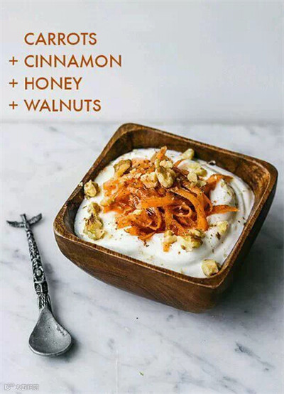 胡萝卜条和蜂蜜+肉桂混合拌匀,淋到酸奶上,加入碎核桃,开吃!