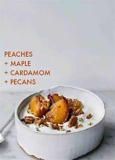 桃子去核切成瓣,和枫糖+豆蔻果实拌在一起。进烤箱,180°直到软掉。最后放入常温或者温一点的酸奶内,撒入胡桃碎片。