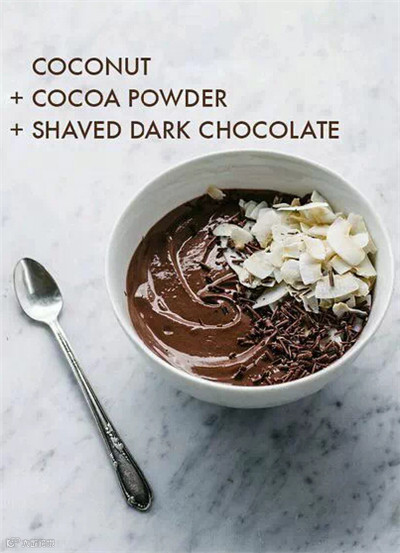 把椰子肉切成片状,进烤箱,175°,直到变成焦黄并伴随着高端大气上档次的椰香芬芳,就可以拿出来了。在酸奶里面拌上碎黑巧和可可粉,放入冷却后的椰子片。