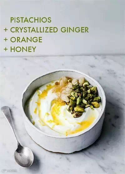 将蜂蜜、橙汁以及橙子皮混合淋上酸奶,撒上碎姜糖和碎开心果。
