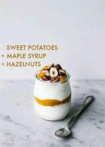 把甘薯用锡纸包好进烤箱,175°,直到它变软。去皮捣烂后和枫糖浆拌在一起,放入酸奶内。最后别忘了把碎榛子撒上去。