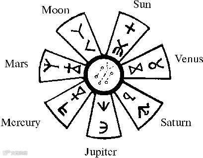 V. Beshevliev认为七个光芒很可能意味着古人看得到的七大星:太阳、月亮、火星、水星、木星、金星和土星,这些星星在古代占卜中扮演了重要的角色。《 Proto-Bulgar: Customs and Culture》 (1981)