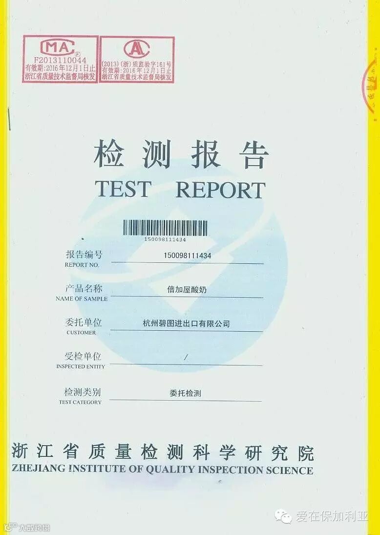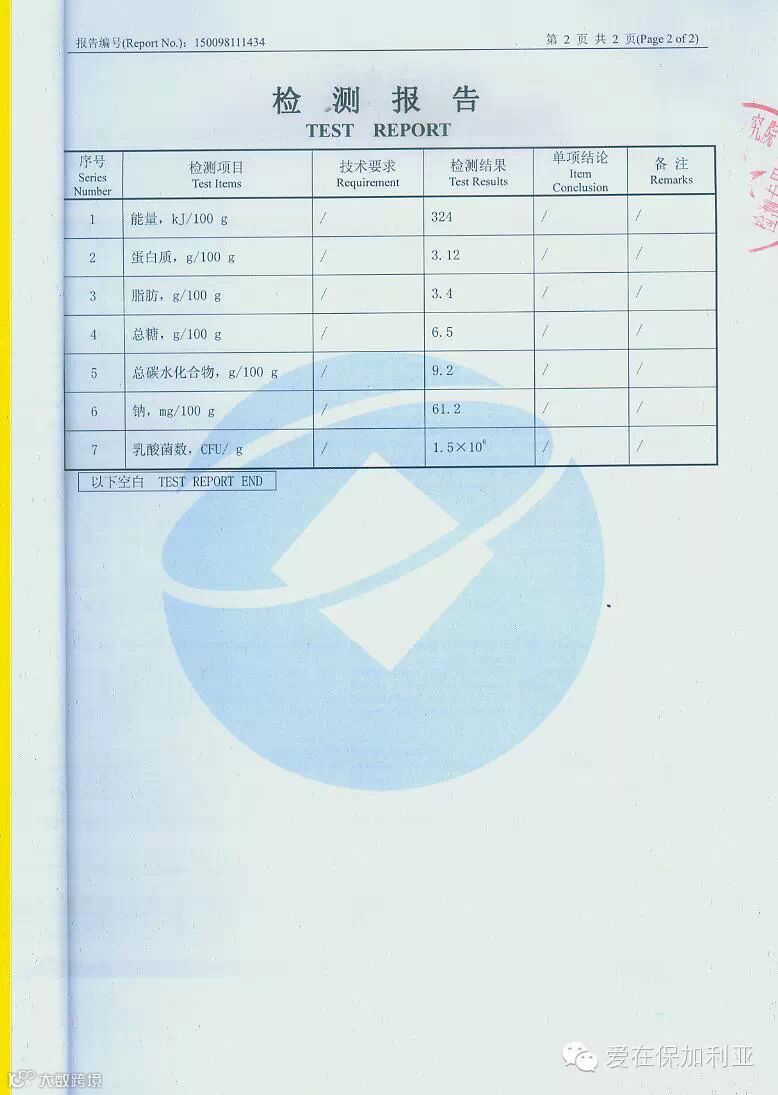 以上是倍加屋酸奶的检测报告,在此报告中可以看出我们每克倍加屋酸奶中含有1.5亿个乳酸菌,远远高于国家标准。