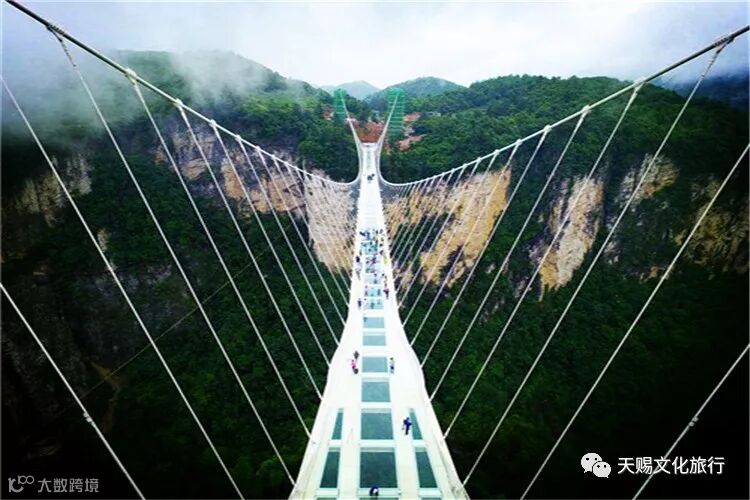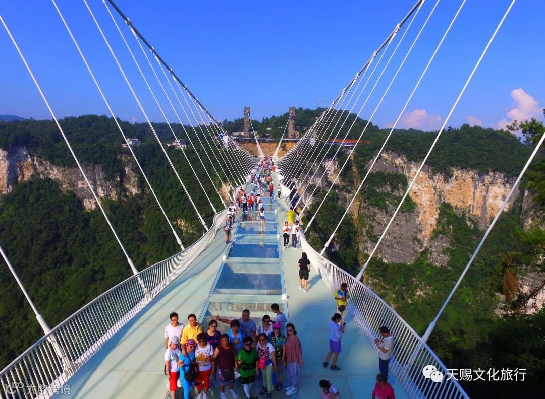 尽兴而归观看张家界大桥全景世界第一长的高山峡谷【玻璃桥】(玻璃桥套餐已含) ,玻璃桥是世界第一长的高山峡谷斜拉玻璃桥奇观、它目前是世界最长、最高的全透明玻璃桥,可站800人,桥长430米,宽6米,全部采用99块透明玻璃铺设而成。走在300米高空的玻璃桥上,桥面全部采用透明玻璃铺设,桥中心有全球最高的蹦极台。仰望蓝天白云,俯瞰溪流潺潺,似漫步云端,超脱尘世,忘却凡间。此玻璃桥还是世界首座斜拉式高山峡谷玻璃桥。
