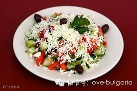 索波斯卡沙拉(ShopskaSalad):用切碎的蔬菜如西红柿,黄瓜,青椒,洋葱等制成,色彩鲜艳、味美多汁、辛辣爽口,带给人们大自然一样的感觉,是喝白兰地的开胃菜。