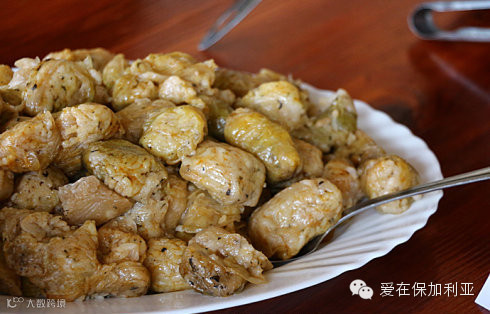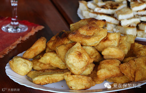 这个看上去类似豆泡的食物,是用面粉和奶酪拌匀,再裹上鸡蛋炸制的,蘸上蜂蜜或搭配保加利亚著名的汤Tarator一起吃很美味,Tarator保加利亚语是Таратор,夏天家家都会常吃,是由新鲜冷汤,酸奶,切碎的黄瓜丁,大蒜,薄荷,混合制成的,冰冰凉凉的很消暑。