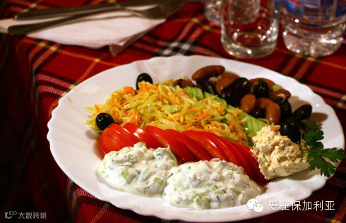 在保加利亚,每餐都是由一份清爽的Shopska 沙拉开始,Шопска салата是由改刀的生菜、西红柿,黄瓜,烤红椒,洋葱,橄榄,再根据个人口味加些果醋、橄榄油和盐制作。
