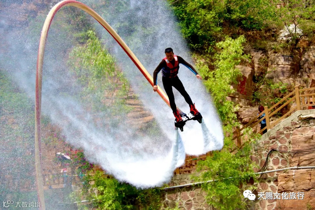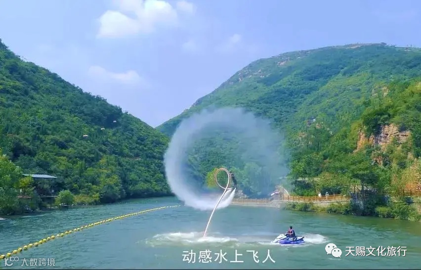 水上飞人—以高山为背景,以湖面为舞台,在水柱的支撑下,白浪飞腾,极限运动员为您展示前后空翻、空中回旋、蛟龙出水、360度转体一系列高难度特技动作,无论是翻腾跳跃还是停驻空中,花样繁多的表演让人惊心动魄,极具视觉冲击力的展示。