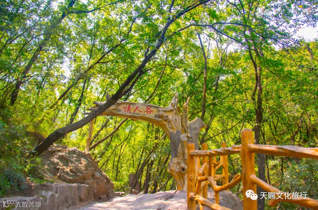 情人谷全长2公里,是一条原始粗犷、蜿蜒曲折、陡峭险峻的白色峡谷,有揽胜峰、财神洞等景点,谷中绿树成荫,岩石奇瑰,流水潺潺,令人心旷神怡,是有情人相约的绝佳之处,故名情人谷。