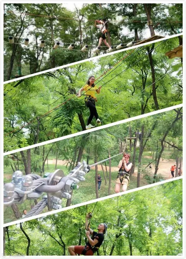 1、在数千亩森林环境中畅快森呼吸,体验泰山归来般丛林间的游走,钢丝绳上的摇曳,溜索上的勇敢与激情!