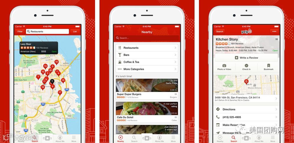 在美国最好用的找餐厅app非Yelp莫属,只要输入你想吃的食物类型和地区,就可以找到附近大家推荐的餐厅,所有的餐厅信息也都清楚列在上面,还可以看到大家的评论喔!
