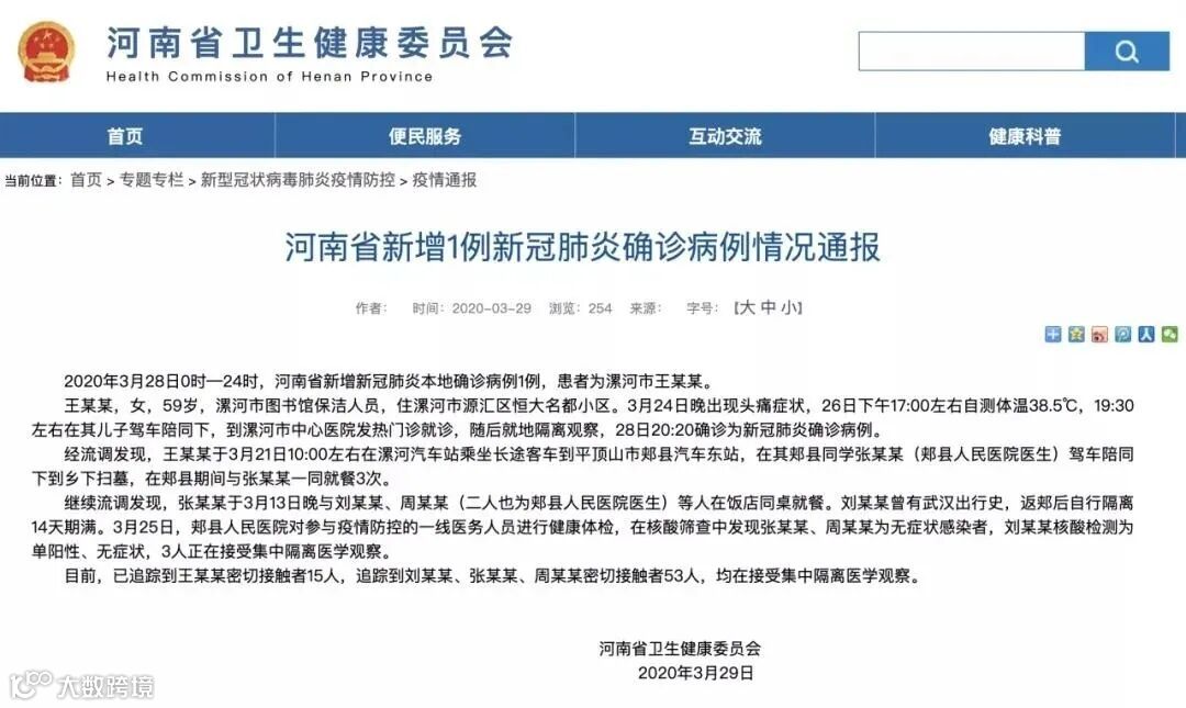 2020年3月28日0时—24时,河南省新增新冠肺炎本地确诊病例1例,患者为