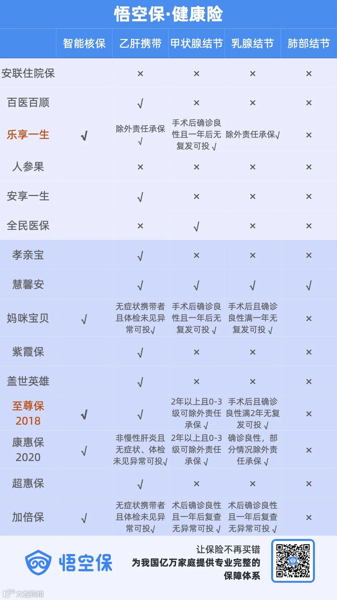 乙肝携带、结节患者,本身就是高风险人群。乐享一生5年期医疗+至尊保2018,通过智能核保的形式最大程度上放宽了健告的严格度。建议有这方面需求的小伙伴,通过此两款产品,做全健康保障。