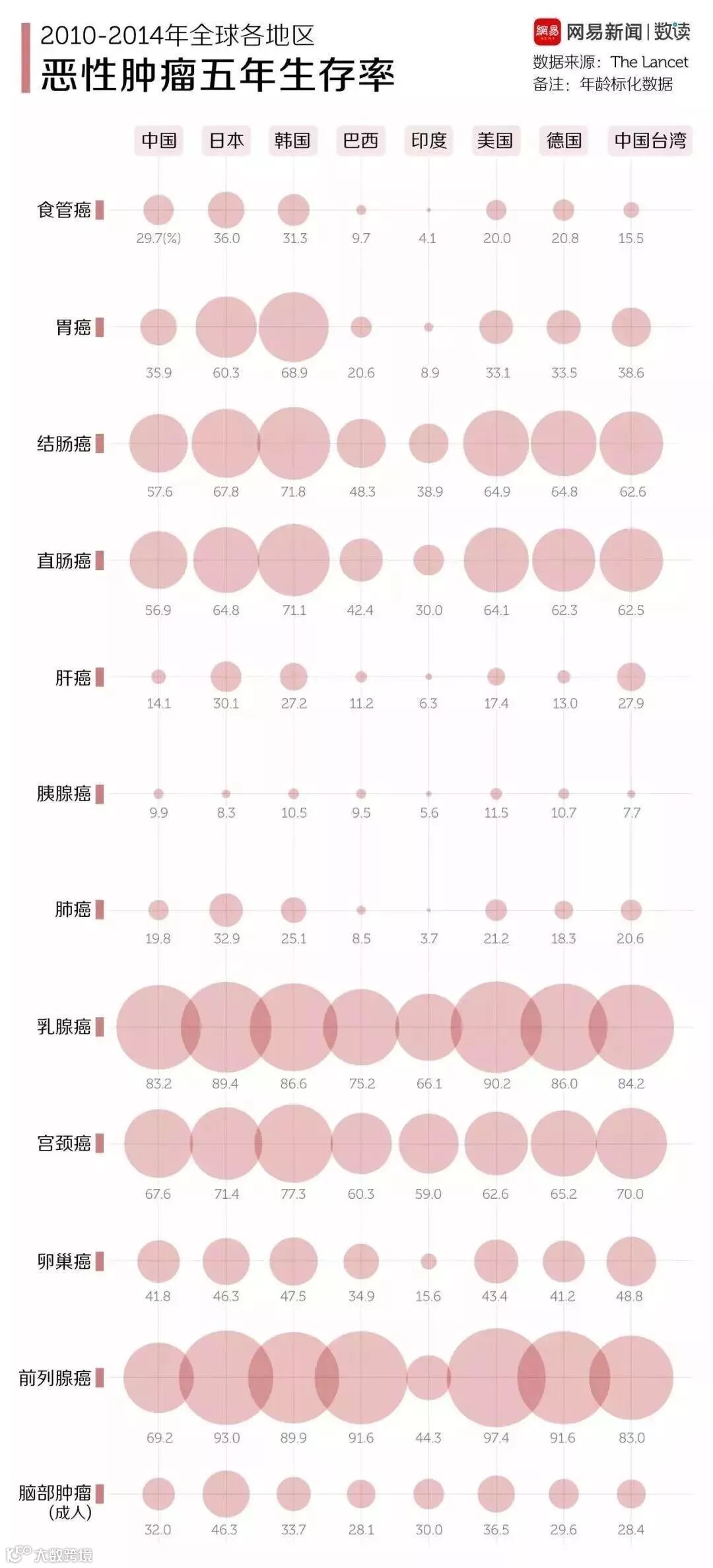 下图是几个国家的恶性肿瘤的五年生存率情况,可见癌症五年生存率超过50%的病种并不少: