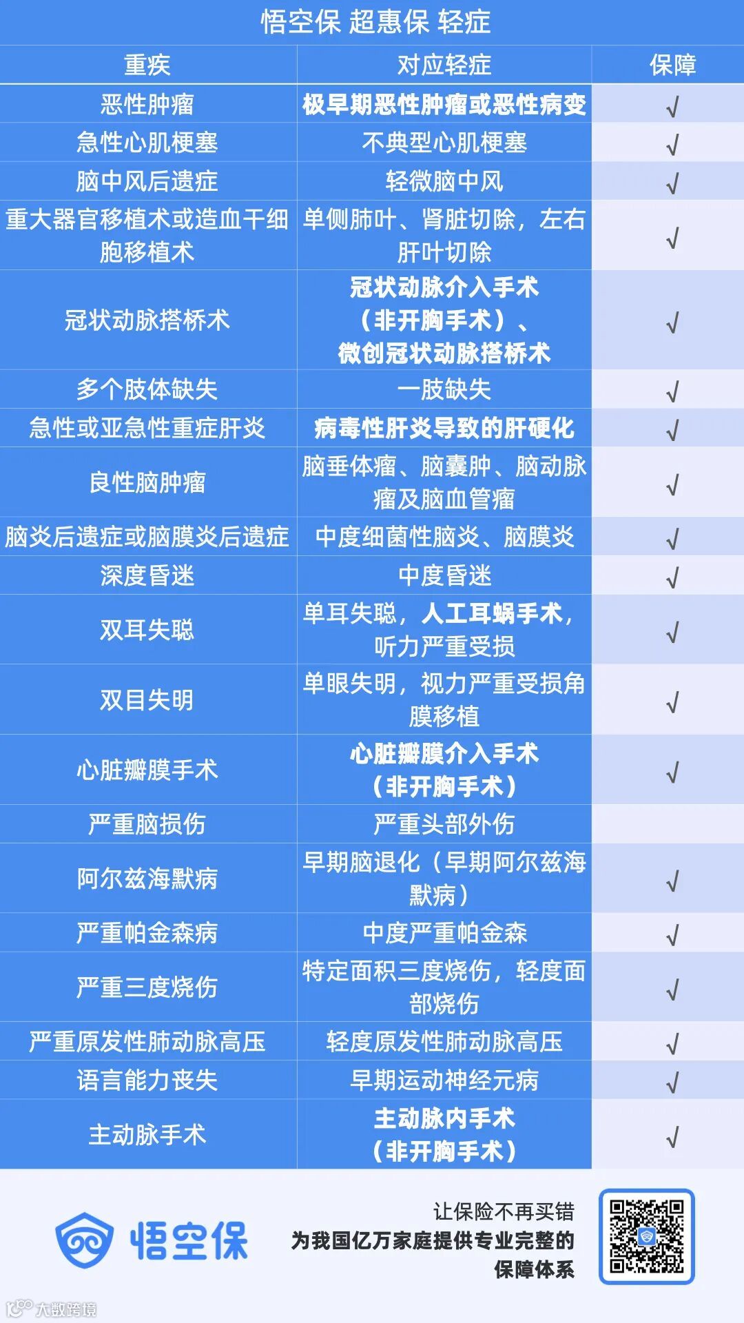 因此,悟空超惠保,将对身体影响较少的(非开胸的)冠状动脉介入手术、心脏瓣膜介入手术、主动脉内手术、微创冠状动脉搭桥术,包含在了50种轻症之中,让投保者能够以最优的手术、享受最全的保障。