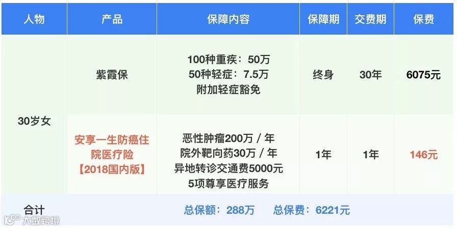 从图表中可以见到,安享一生癌症医疗险2018版,30岁女性一年仅需146元,加上50万的重疾险保障,该用户的健康层面保障可以说是非常全面了。