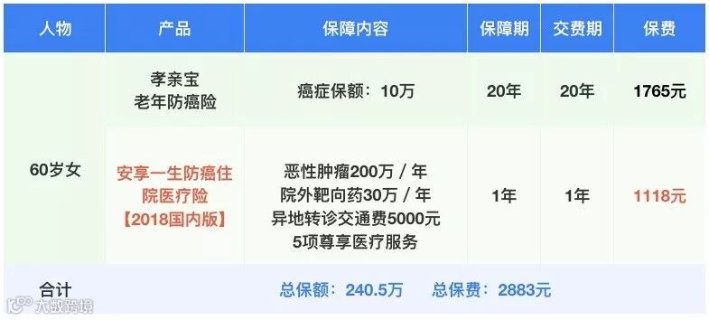 从图表中可以见到,安享一生癌症医疗险2018版,60岁女性一年仅需1118元,加上孝亲宝老年防癌险10万保障,总额也仅需2883元,是一份给父母投保的高性价比方案。