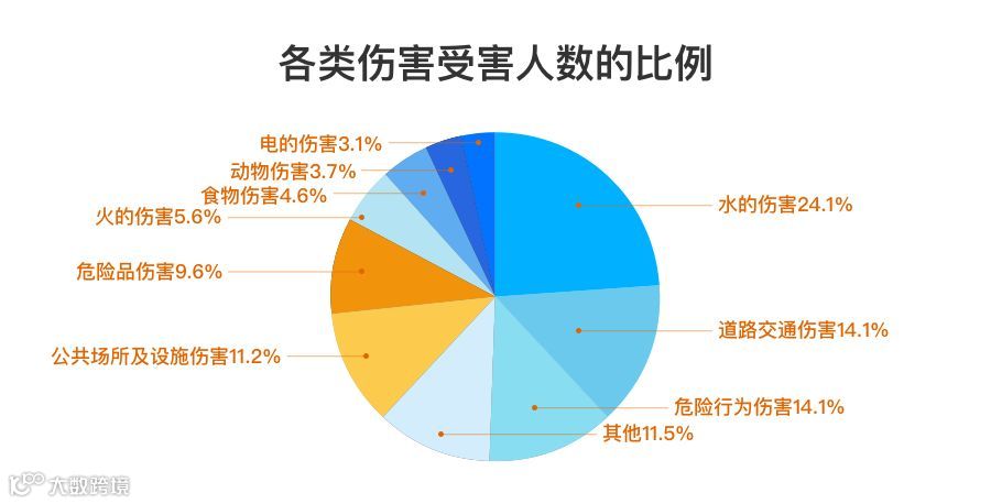 据有关部门对全国11个城市4万多名少年儿童进行的调查显示,我国每年有20%-40%的儿童因意外身故、残疾或进行医学治疗。中国保险行业协会2017年发布的《中国保险人群意外伤害风险研究报告》显示,0-9岁儿童意外事故前四大原因分别是意外溺水或水灾、跌倒坠落、行人交通事故、机动车驾乘人员交通事故。