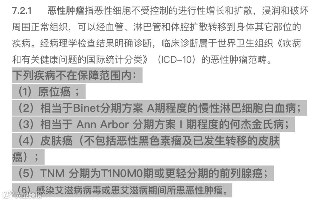 这些轻症种类大多都是重大疾病条款中“下列疾病不在保障范围”的除外责任,比如恶性肿瘤和原位癌的关系: