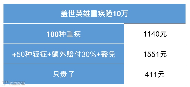 我们来看看附加轻症后的价格,以一位30岁的男性投保10万盖世英雄重疾险为例,每年只需400多元,就可以增加50种疾病保障,还可以减少理赔时和保险公司之间的纠纷的概率,是不是觉得附加上轻症会更划算呢?