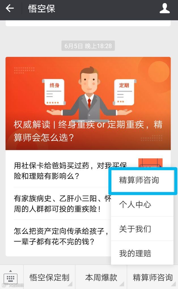 在微信公众号【悟空保】下方菜单点击【精算师咨询】,进入顾问问诊服务页面,点击【立即咨询】提交申请。