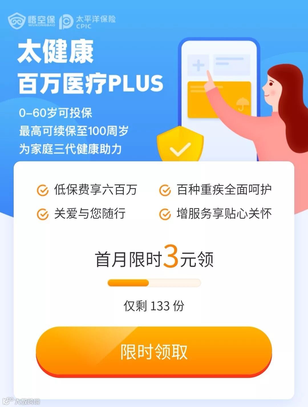 首月3元是悟空保目前在做的优惠活动,活动可能会不定期下架,所以如果想按该优惠价格购买的朋友,要抓紧时间。