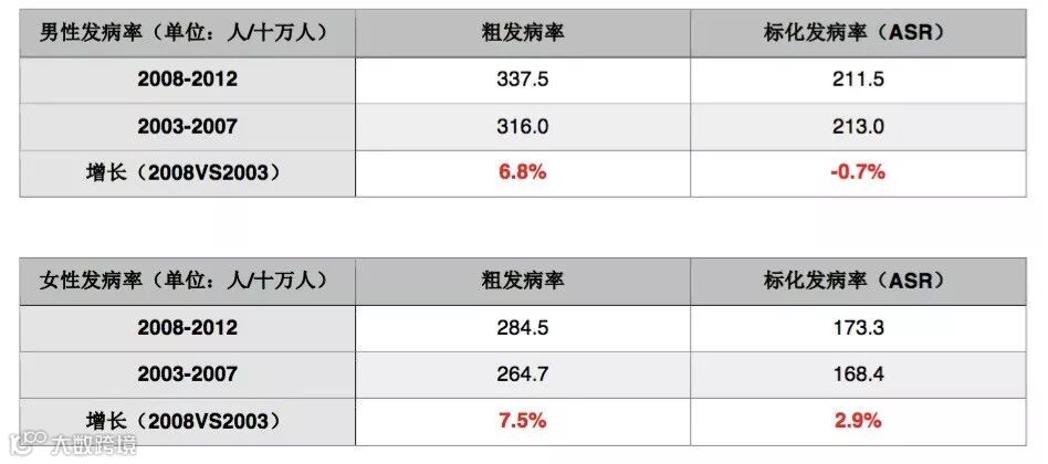 2017年10月16日,世界卫生组织国际癌症研究机构(IARC)通过对比2003-2007年的统计数据,2008-2012癌症发病率(粗发病率)整体是上升的,其中男性发病率为337.5人/10万人,对比2003-2007的数据增长6.8%,女性发病率为284.5人/10万人,对比2003-2007数据增长7.5%。但是经过年龄标准化后,男性整体发病率呈下降趋势,而女性还是呈上升趋势,主要是由于宫颈癌和甲状腺癌发病率的急速上升引起的。