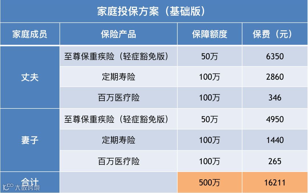 注:夫妻保险方案说明:为夫妻双方配置200万的定期寿险,覆盖承担家庭责任的重要阶段;50万的终身重疾搭配100万的百万医疗险提供重大疾病风险后的风险保障。