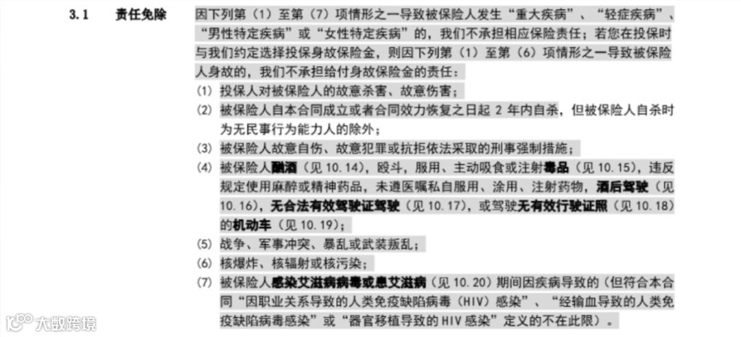 投保前仔细看《保险合同》一般都有责任免除,健康险中将罹患艾滋病(AIDS)、违法犯罪、战争、核武器等导致的事故列为除外责任;