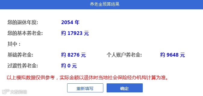 最后测算出来的结果是2054年退休,养老金是17923元。