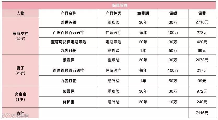 我们给家庭支柱的投保建议是:先为自己配置好重疾险、寿险、意外险和住院医疗险,为妻子购买重疾险、意外险和住院医疗险,为孩子购买重疾险和意外险。