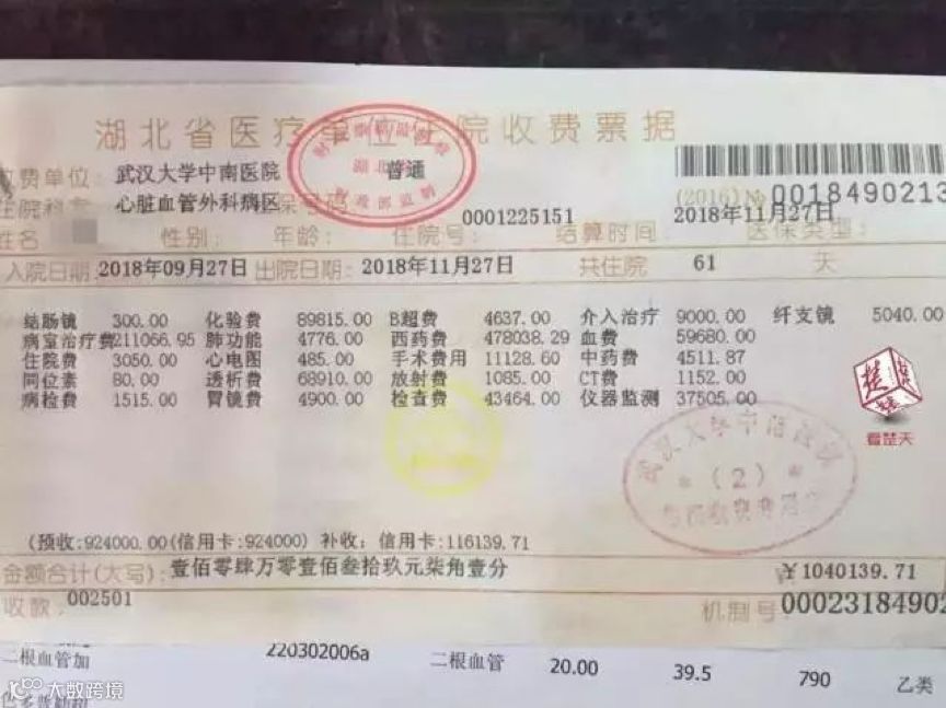 不得不使用的先进设备费用:以人工心肺仪为例,每天就得2万元,使用时间长达9天,少说18万。
