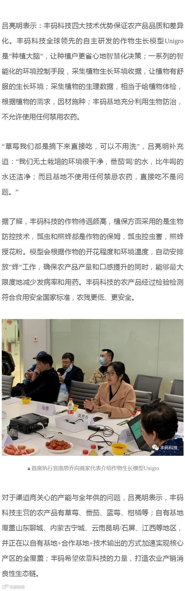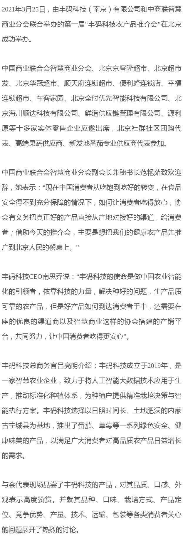 内容提要:图灵院在孵企业「丰码科技」是一家可持续农业解决方案供应商,是南京农高区引进的第一家智慧农业企业。2021年3月25日,由丰码科技和中商联智慧商业分会联合举办的第一届“丰码科技农产品推介会”在北京成功举办。