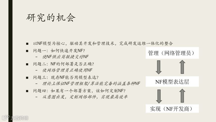 这种部署的优势是减少硬件资产管理的复杂度,从而提高运维效率,但是也引入了新的问题:如何敏捷的开发交付网络功能软件?如何将这些网络功能软件整合到最近更智能的网络管理算法和框架中?由此,吴文斐教授向大家揭示了关于这一问题的研究热点在于: