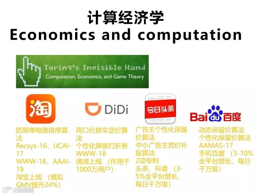 紧接着,唐平中教授为大家介绍了AI算法与市场结合的几个实际应用,分别是百度搜索广告中的保留价项目,淘宝平台的防刷单流量分配算法以及滴滴拼车的动态定价算法等等。