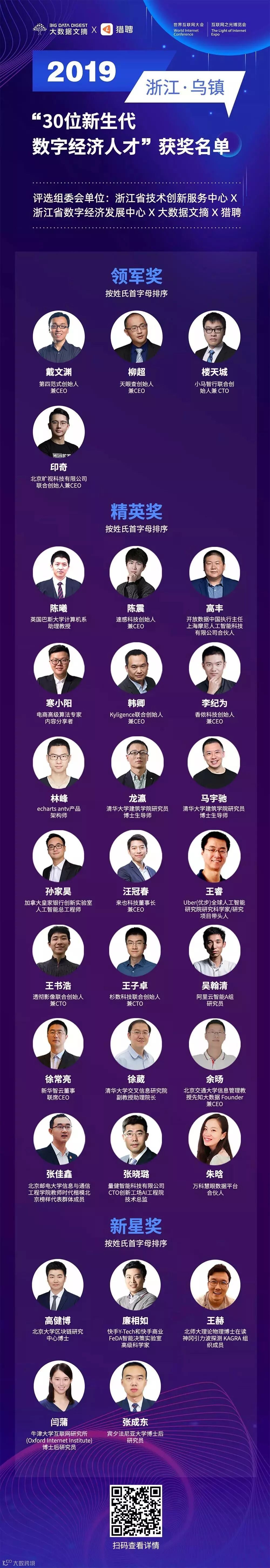 10月19日,第六届世界互联网大会“互联网之光”博览会·数字产业人才研讨会在浙江乌镇互联网国际会展中心顺利召开。会上,浙江省技术创新服务中心、浙江省数字经济发展中心联合《大数据文摘》和猎聘,颁发了2019年“30位新生代数字经济人才”奖项。