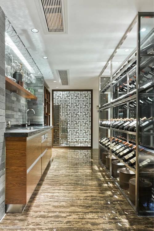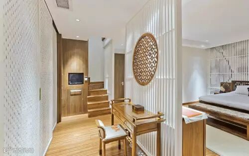 舒适的岛型浅灰色真皮沙发,极赋韵律的灯光。电视墙细腻的木艺雕花色彩浓重而成熟,极其现代的陈酒架与之完美结合,细腻的大理石背景墙更显自然、理性、沉稳;极为生动的电梯厅巨幅木艺涟涟墙面,取“如鱼得水”之意;客房简朴优美、内敛淡雅,追求一种宁静悠闲的生活境界。