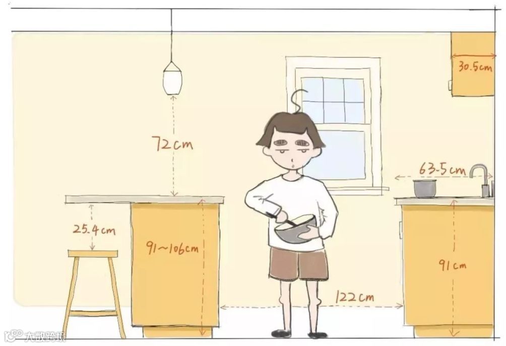 岛台与橱柜之间必须留120cm以上的距离,才能保证做饭人以一种很舒适的状态通过,同时可以蹲下去拿取橱柜里的东西。