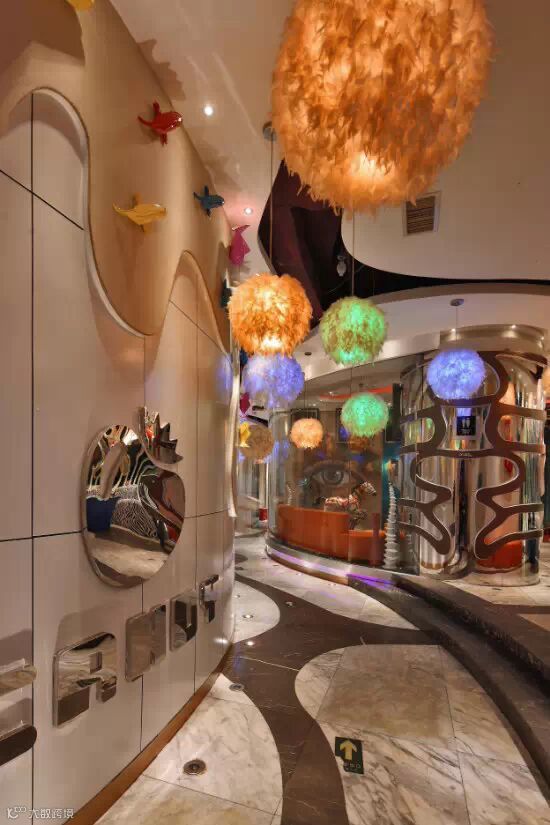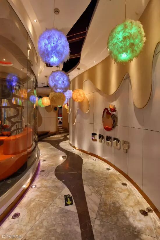 在大门处,绣球般的吊灯与花鸟虫鱼的情境造型与墙面上的彩绘相得益彰,光怪陆离,好似进入了一个童话般的世界;而进入内场走道,你会发现风格又发生了变化。