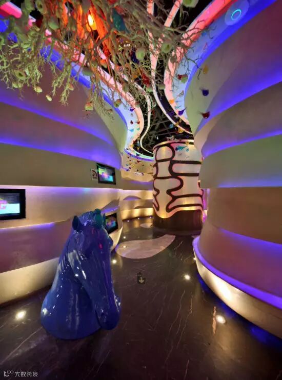 不规则的墙面在灯光的营造下神秘而又有趣,在凌乱的桁架和管道下,由发光灯管构成的天花沿着墙的形状延伸到远方,感觉又好像进入了一个溶洞,卡通造型随处可见,成人的内心,其实也有童趣,否则糖果盒的秘密就无从发现了。