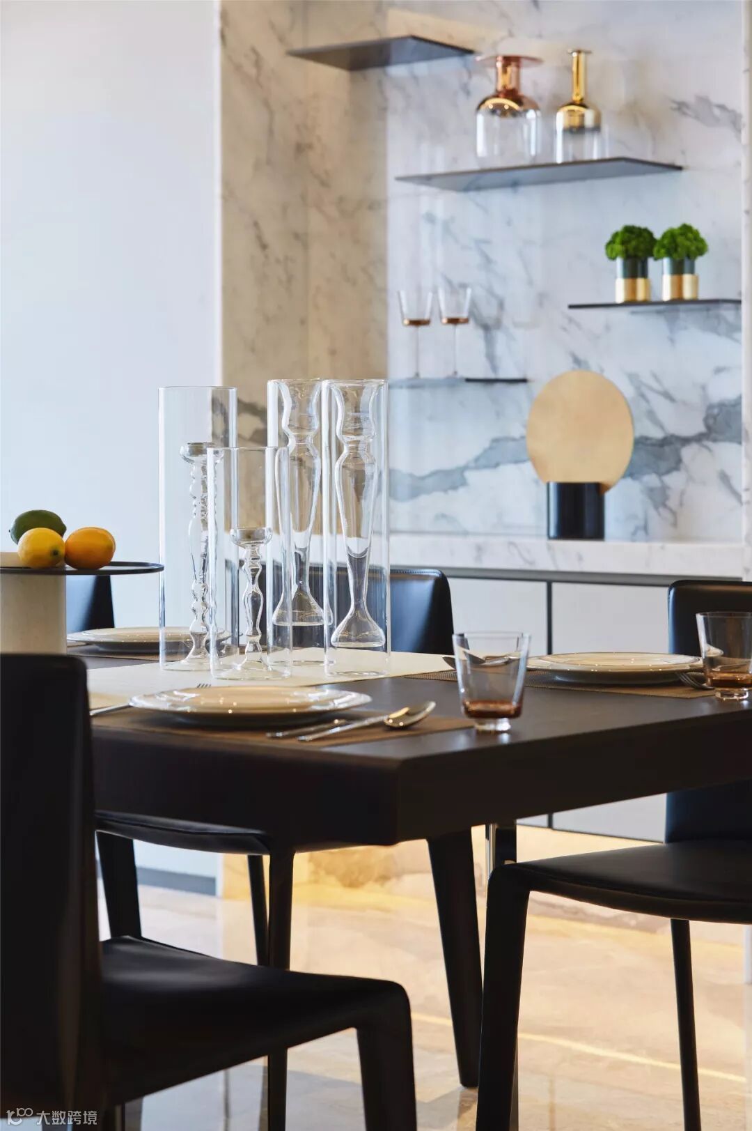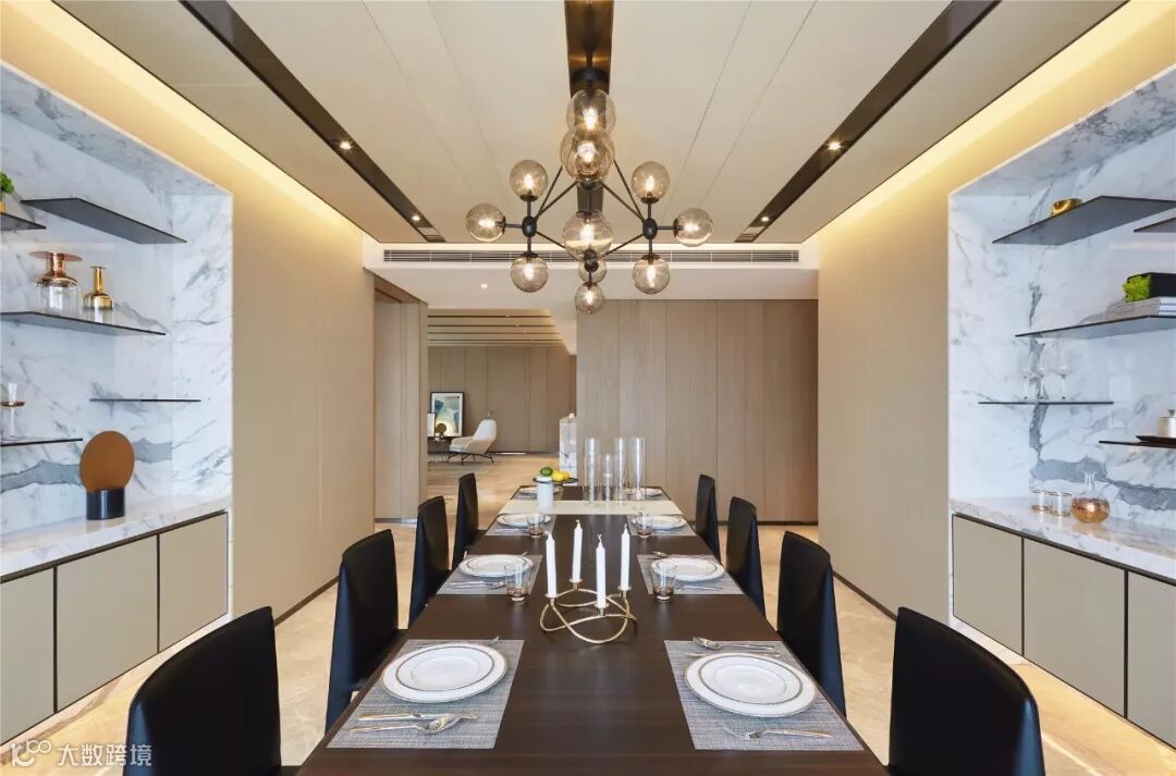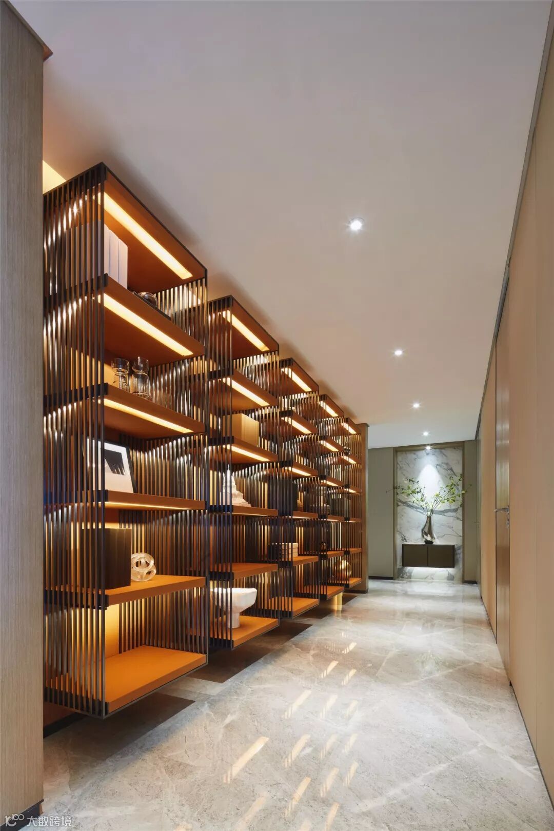 设计师在狭长的走廊区域,引入展厅的概念,通过材质、灯光的巧妙分割,提升了收藏品的观赏性。走廊拐角处的白色系大理石与餐厅的置物区遥相呼应。