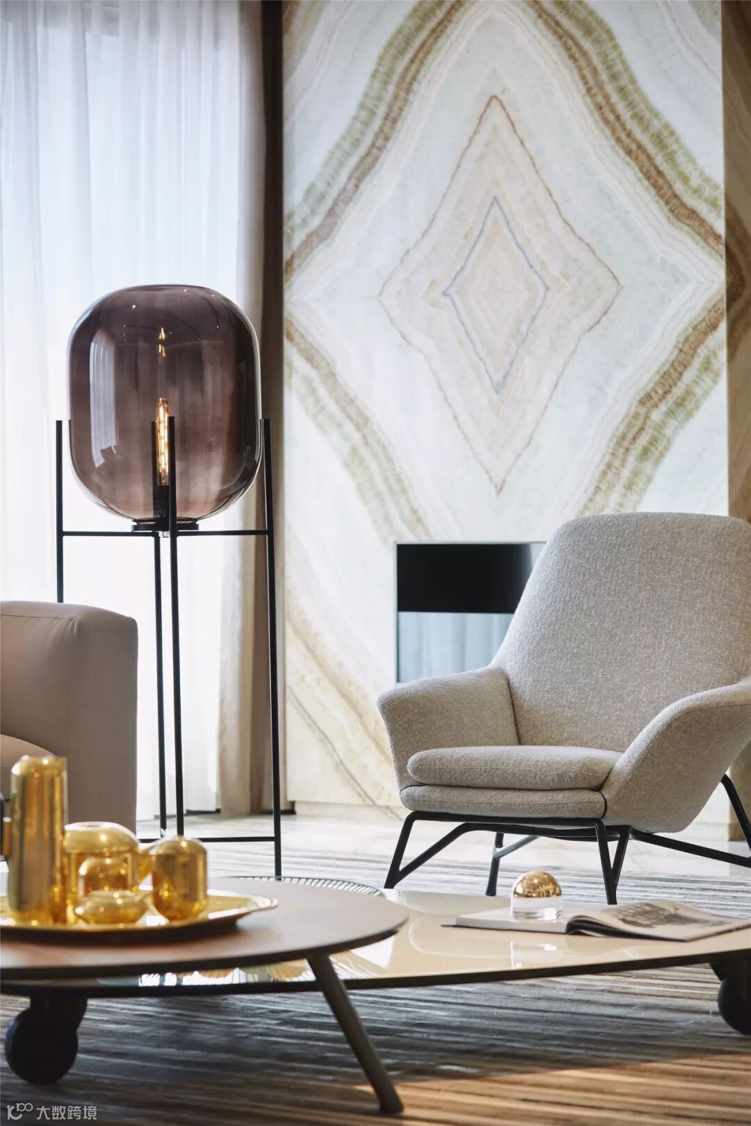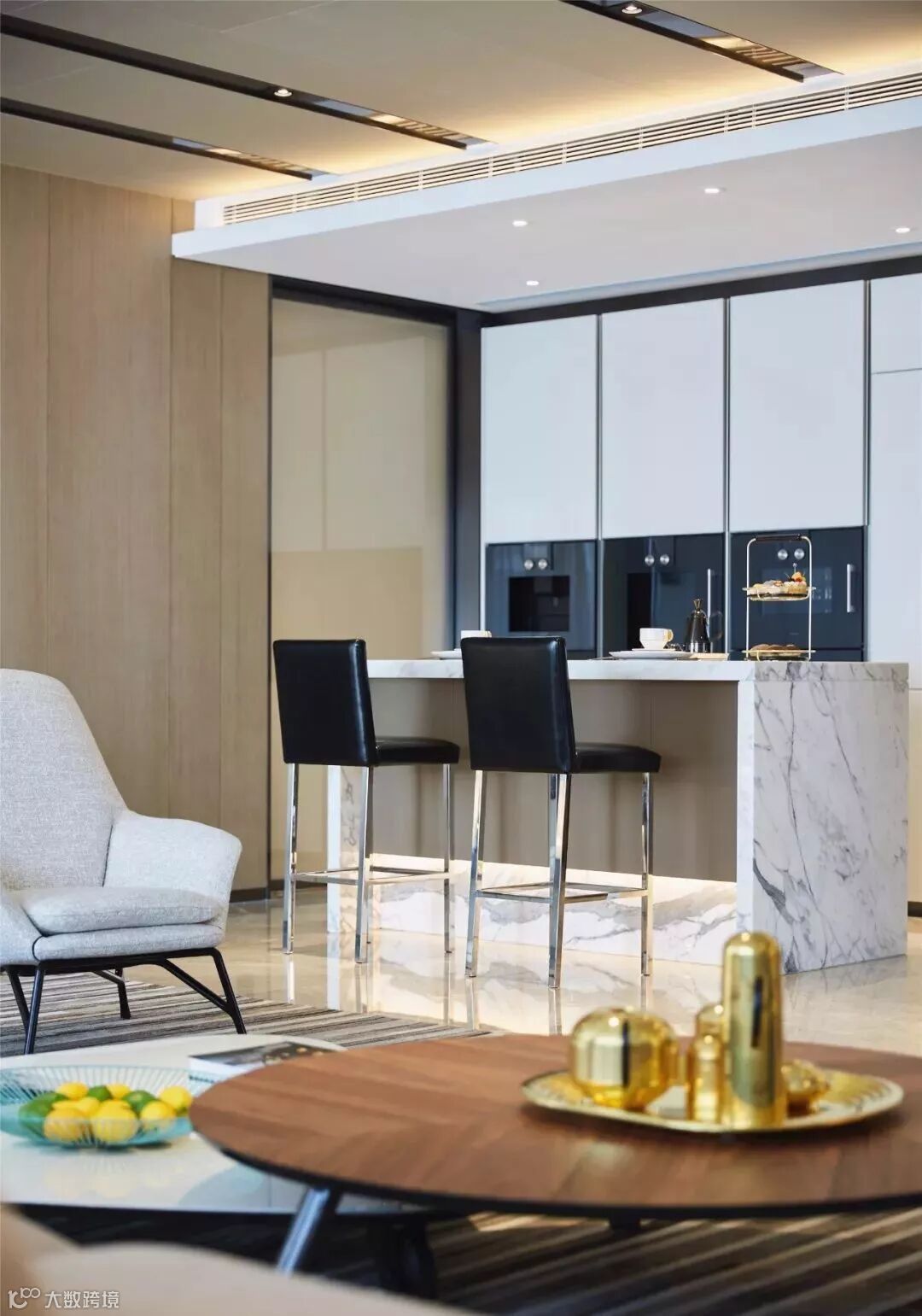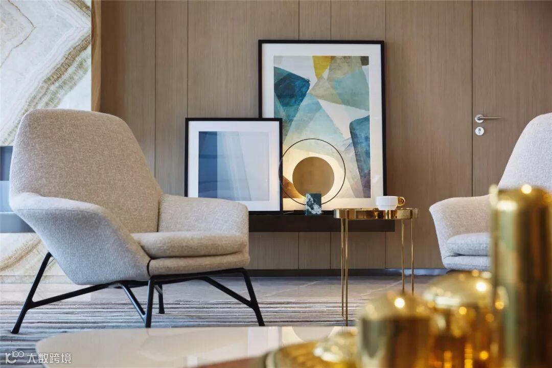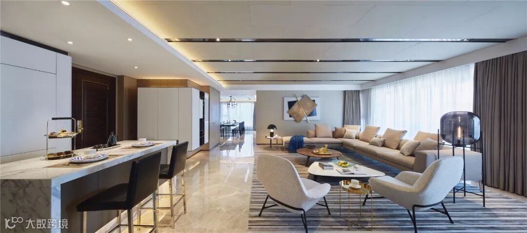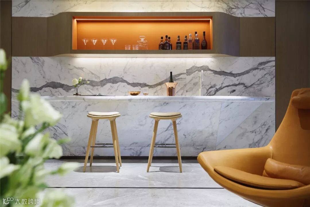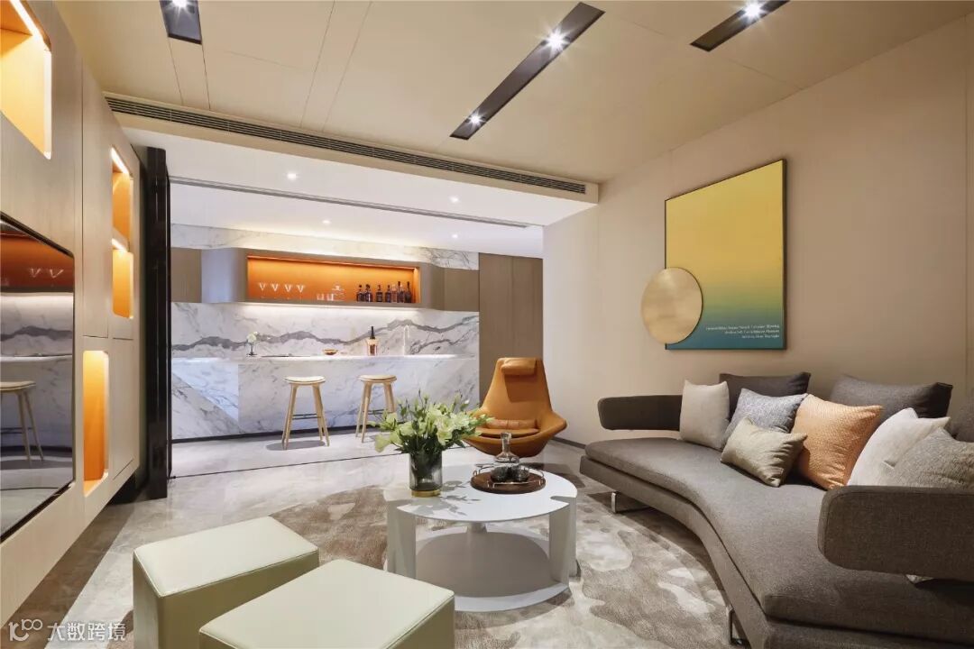 家庭厅凝聚着空间的核心氛围,承载着娱乐、休闲、水吧等功能。为避免吧台影响走廊动线,其吊柜和台面都采用弧形的线条。家庭厅采用玻璃折叠门,可以随时转换为独立空间,强化空间的灵活性以及融合性。在这里可以品酒畅谈、欣赏影音,享受生活的欢愉和多彩。