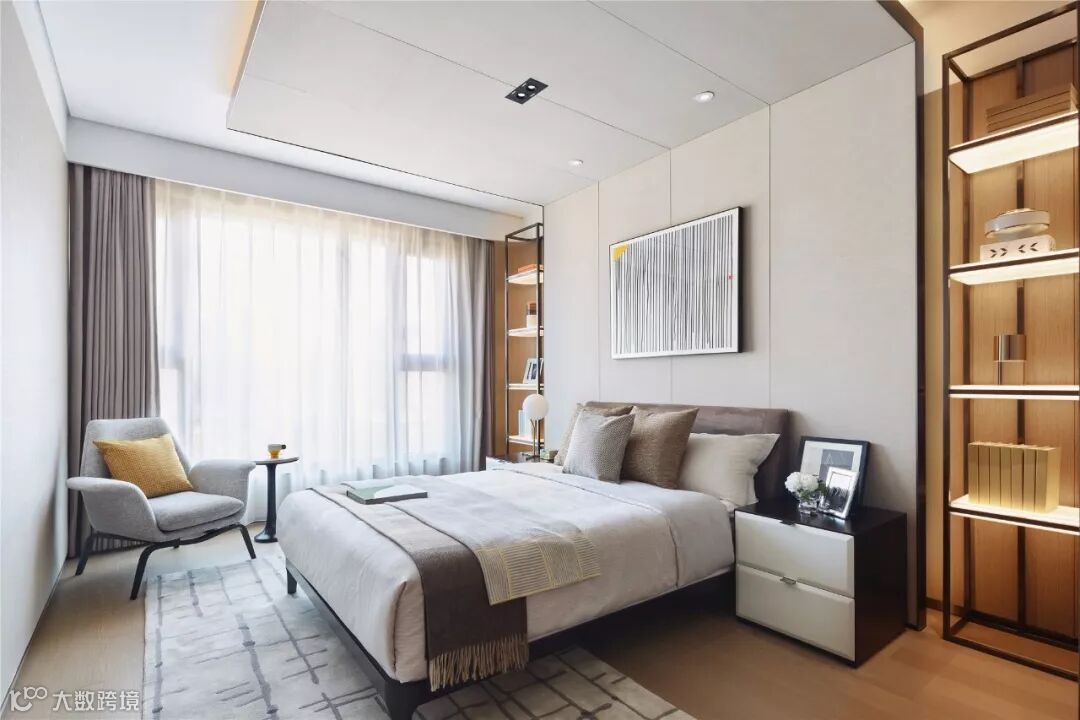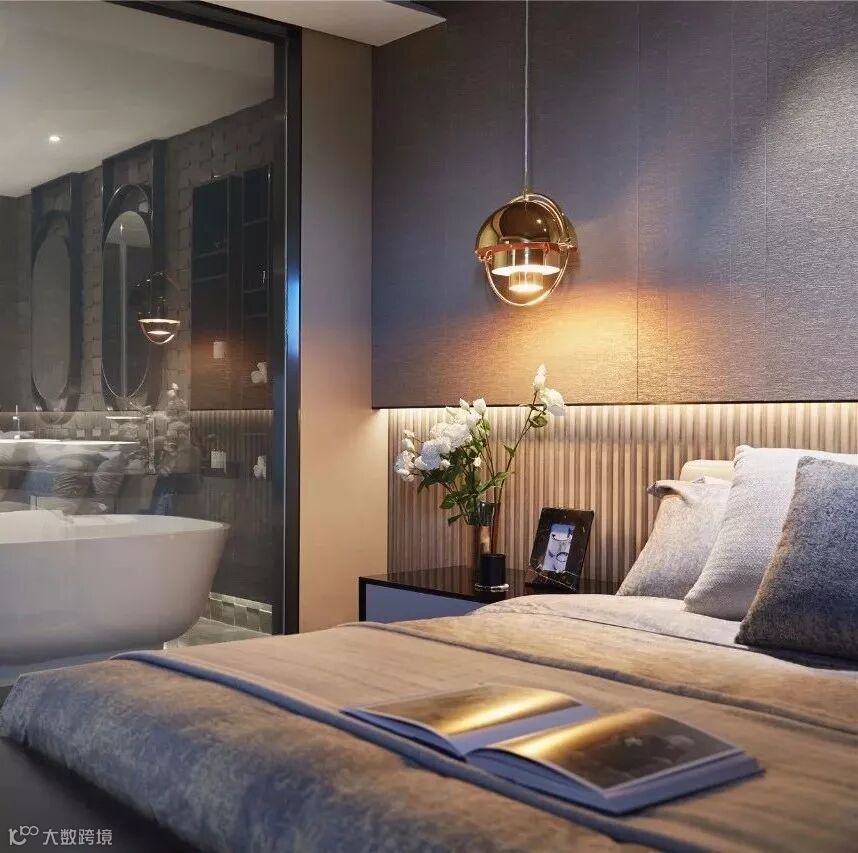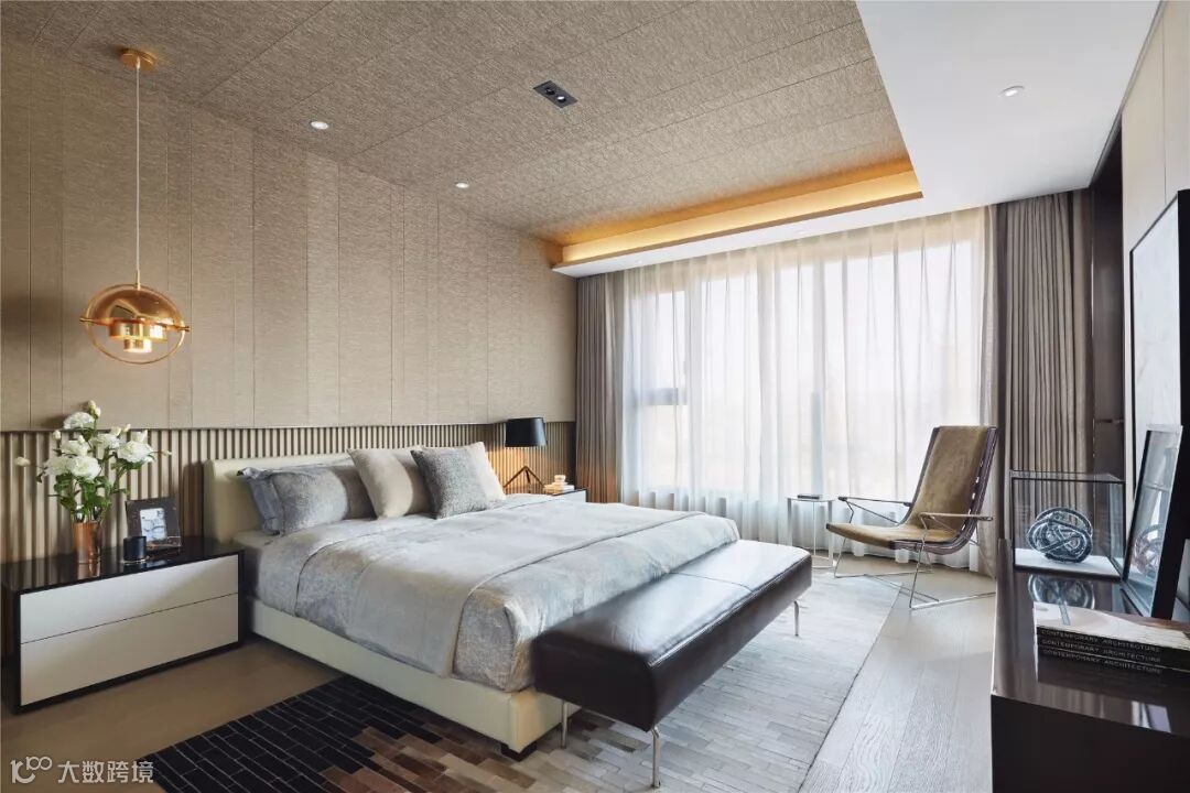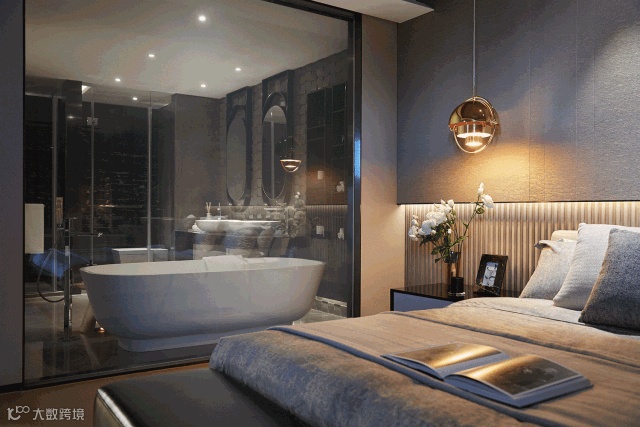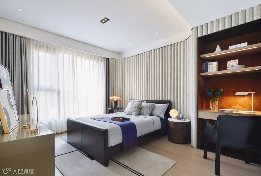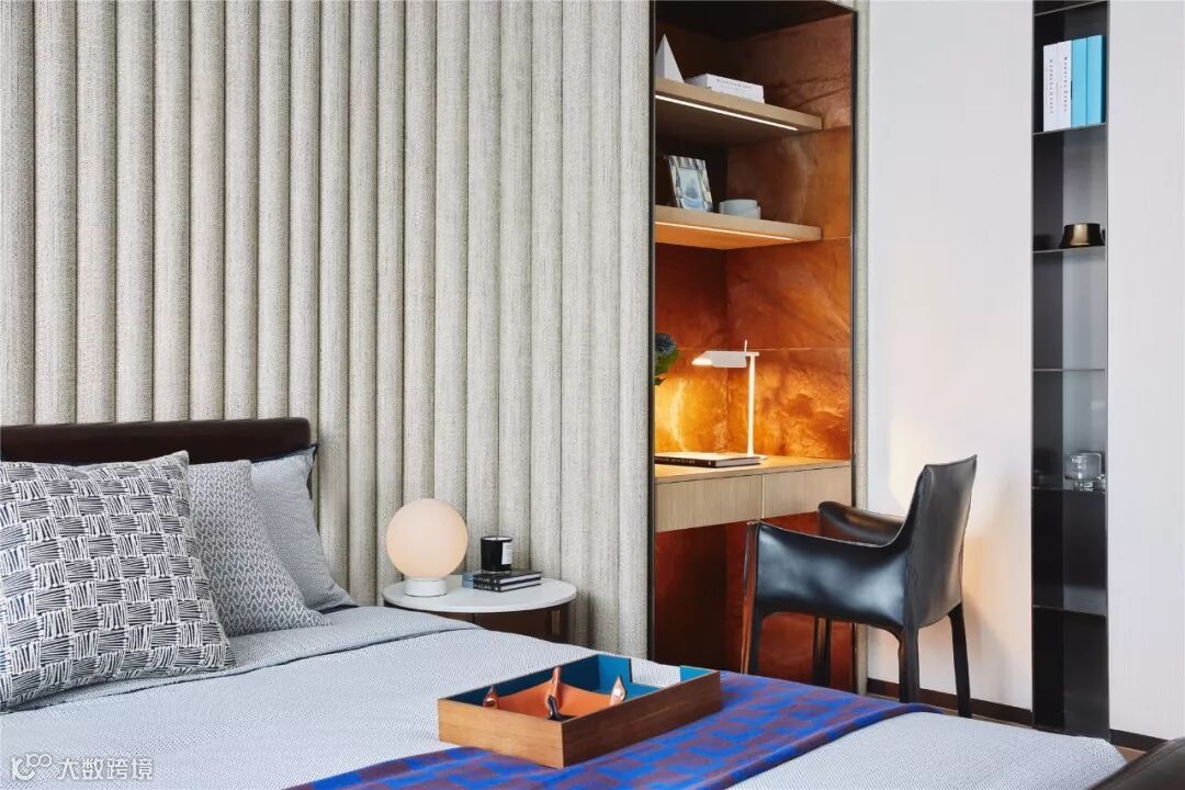 书房、卧室、衣帽间、卫生间共同组成独立的主卧套间,构筑成一个私享的静谧空间。主卧床头背景墙的墙布一直延伸至顶面,搭配下方同色系的木格栅,创造出独特的序列感。智能雾化玻璃分隔主卫与主卧,一键启动便可实现场景的灵活调整。