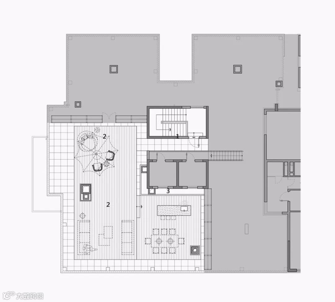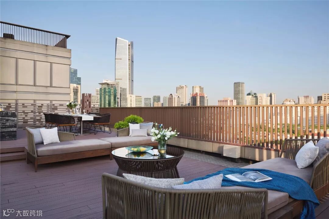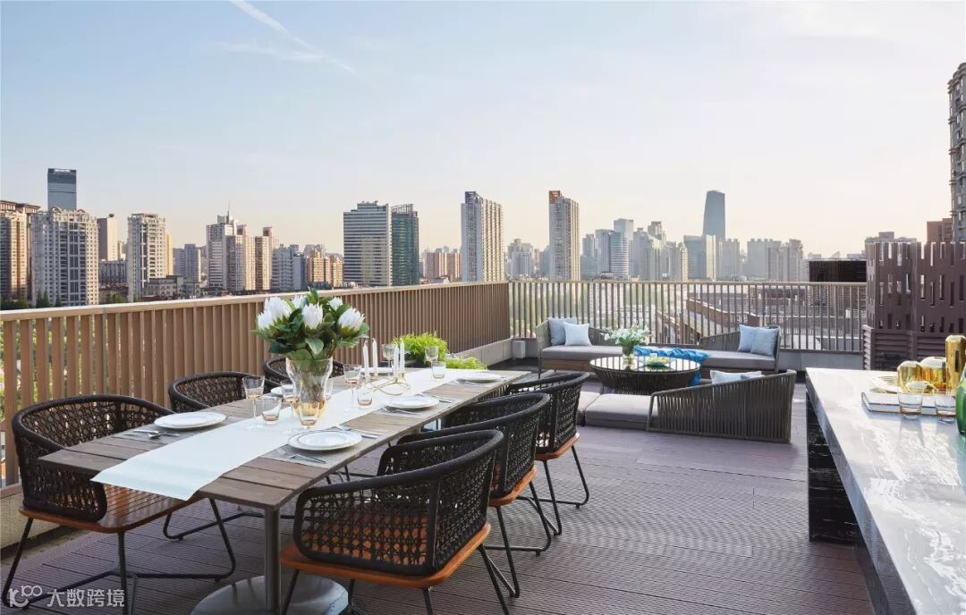 顶楼露台通过地面的高低,分隔出就餐区及休闲区,为派对聚会提供了绝佳的场所。在这里可以纵览城市天际线,在惬意悠然间品味生活的美好。