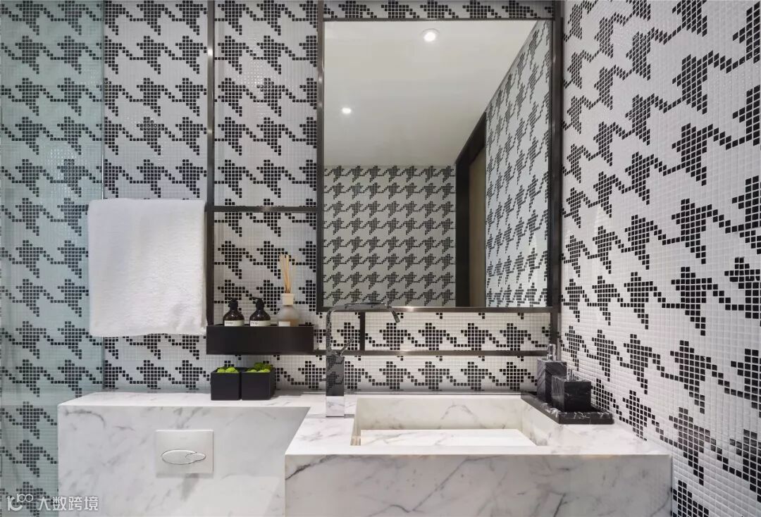 男孩房背景墙采用垂直排序的壁布硬包,蓝色的点缀为空间带来欢愉与温馨。男孩房卫生间立面悬挂金属架,集镜面、置物于一体,搭配千鸟格纹饰背景,表达着前卫不羁的格调。