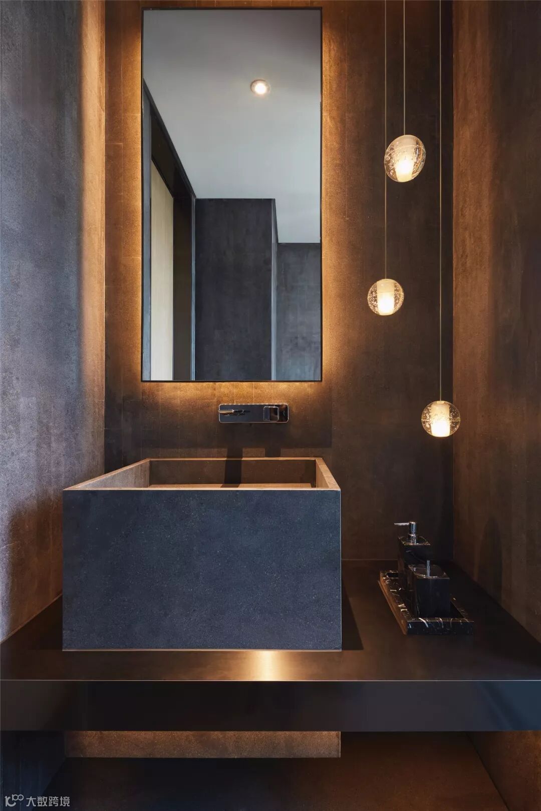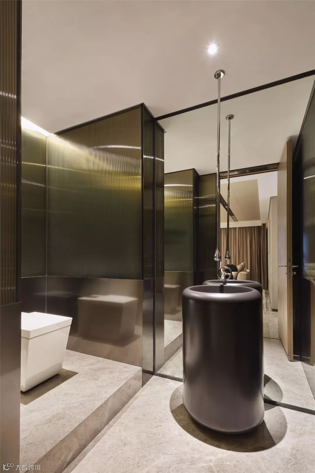 刻花玻璃与不锈钢材质勾勒出客卫的层次感,落地镜面可以有效缓解空间的局促感。水滴状龙头由顶端垂落而下,与圆柱台盆互动,硬朗酷炫,堪称点睛之笔。